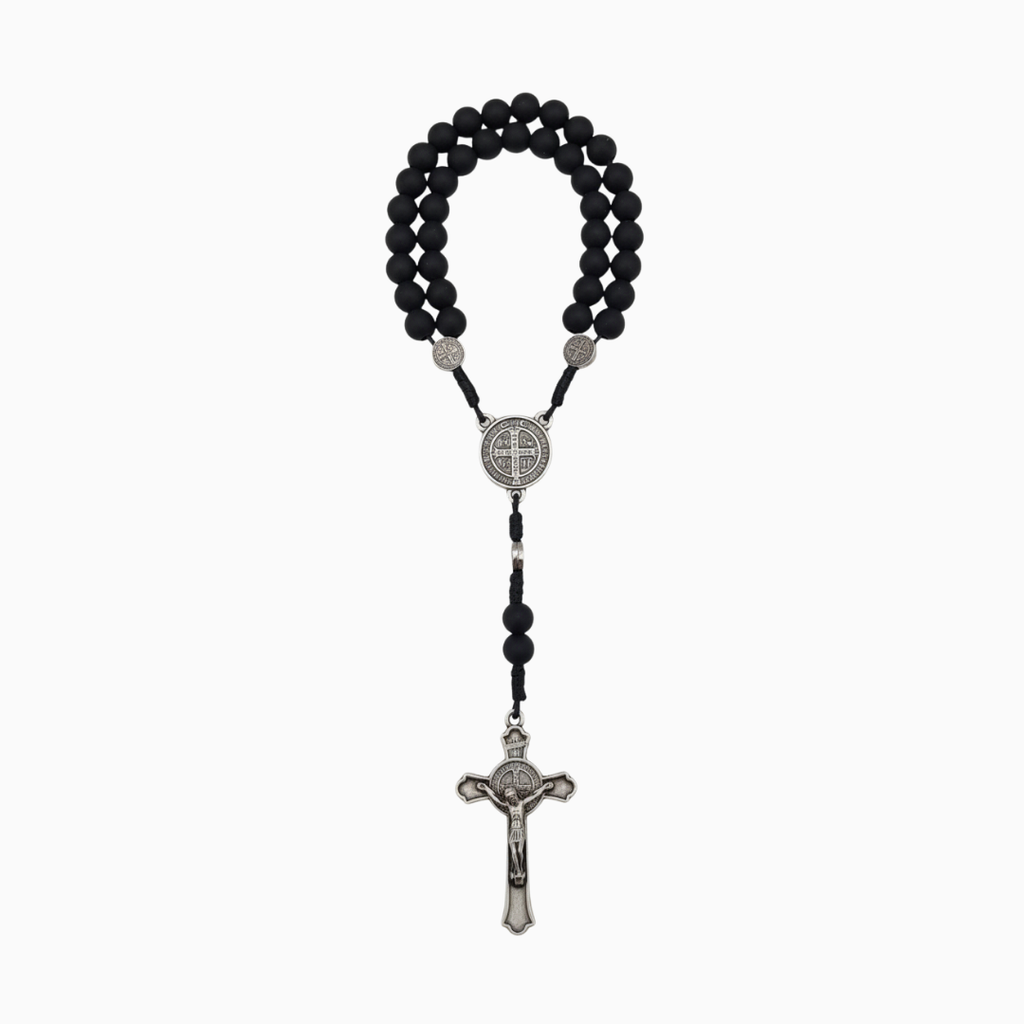 Produzido com contas peroladas pretas foscas, ele traz elegância, sobriedade e uma sensação de paz ao toque. No entremeio, a Medalha de São Bento simboliza proteção contra males espirituais, enfermidades, ataques emocionais e tentações — tradição reconhecida pela Igreja Católica há séculos.